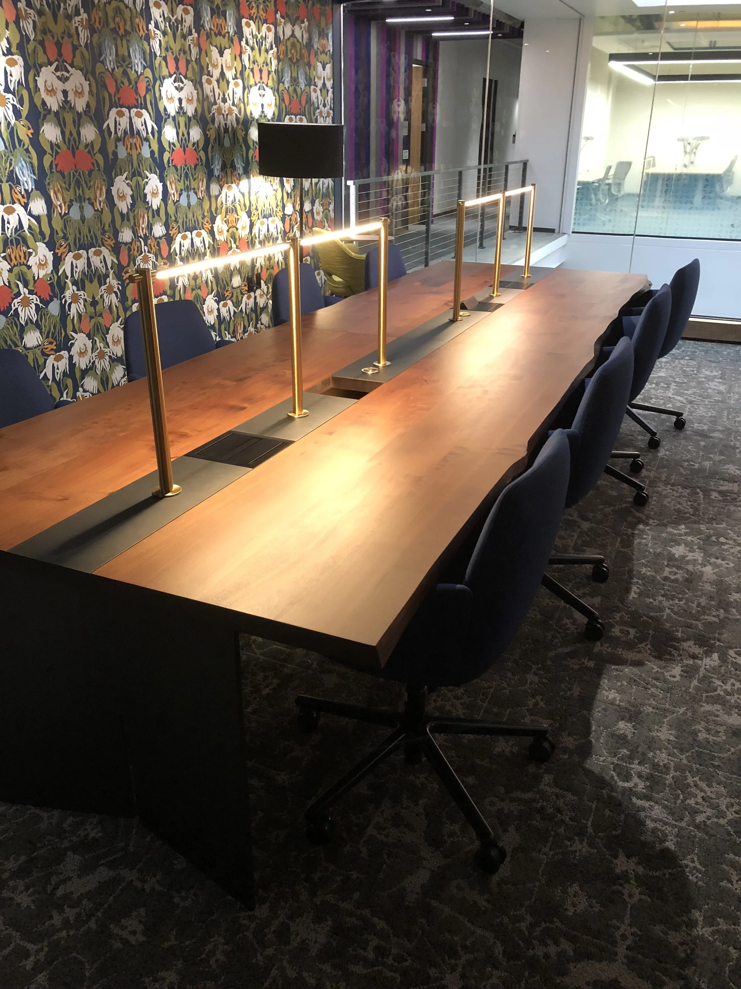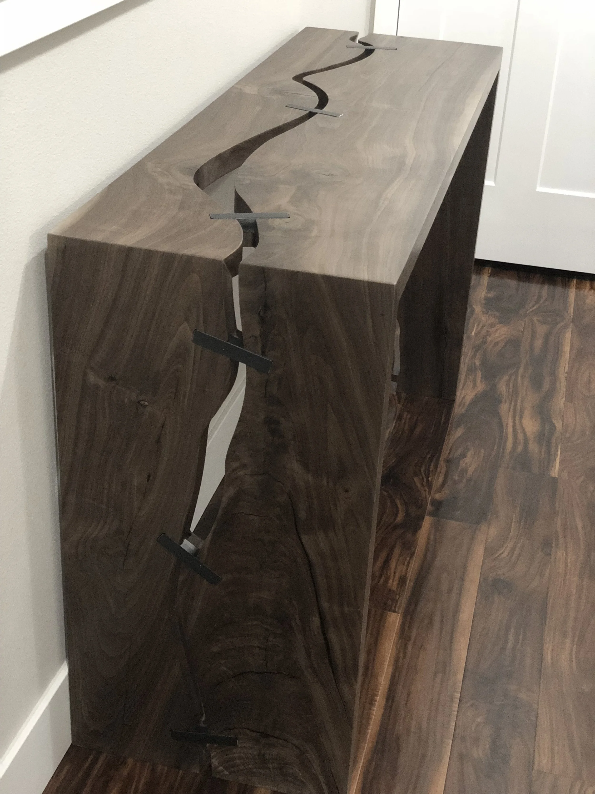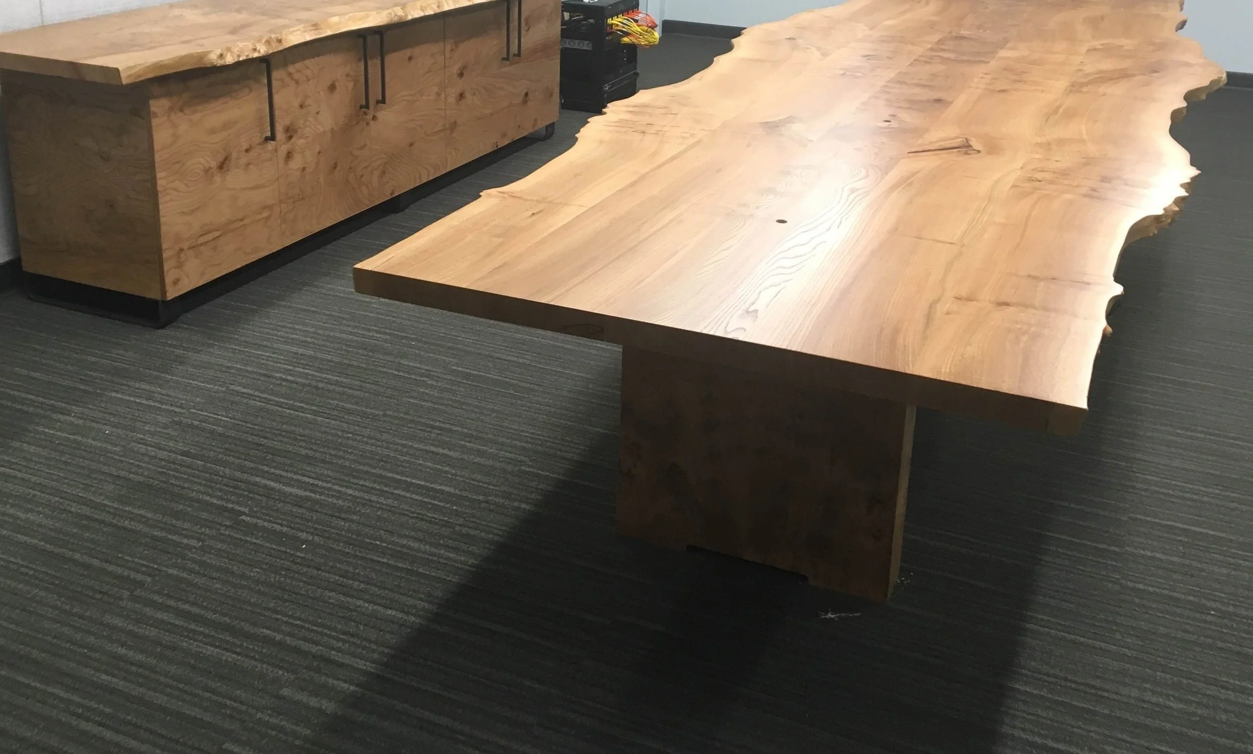 This page is dedicated to show our customers unique ideas we have accomplished for our past projects. We strive to bring exceptional craftsmanship to our customers and designers. White oak live edge elm office credenza and table set Credenza Puzzle table Library table Walnut waterfall Console Table